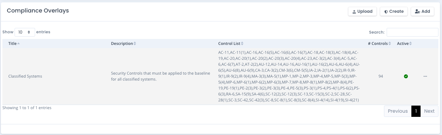 Add a title, description and then add 1 or more controls listed on the right column to save your overlay. When active it will automatically be included in compliance generation as well as SSP control to vulnerability information.