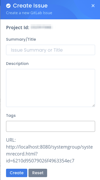 The GitLab integration in OpenRMF® Professional allows you to create issues quickly and easily off various pages within the application that link directly back to your OpenRMF® Professional installation. Once setup, creating the issue is as easy as clicking the Create Issue menu option, filling out the details, and clicking the Create button.