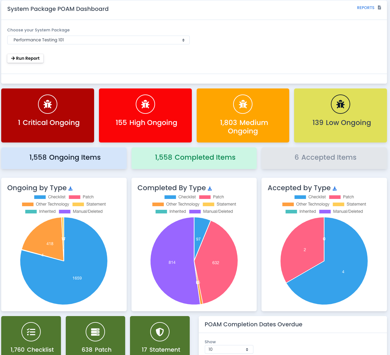 This data comes from all active POAM data in your system package (i.e. you have not deleted them). Checklists, statements, patch vulnerabilities, manual entries, inherited controls and more are used for this report.