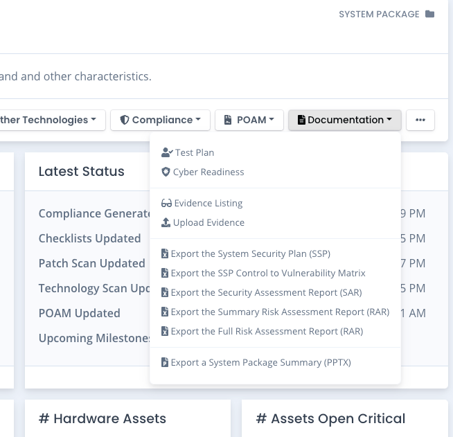 From the System Package dashboard you can click the Documentation menu near the top right and choose the Generate System Package Summary menu option. A MS PowerPoint (.pptx) file is generated based on the latest information of your system package and then downloaded to your computer. You can use this as a starting point for briefings to staff, assessors, management, and āCā level executives for showing an overview of your system package.