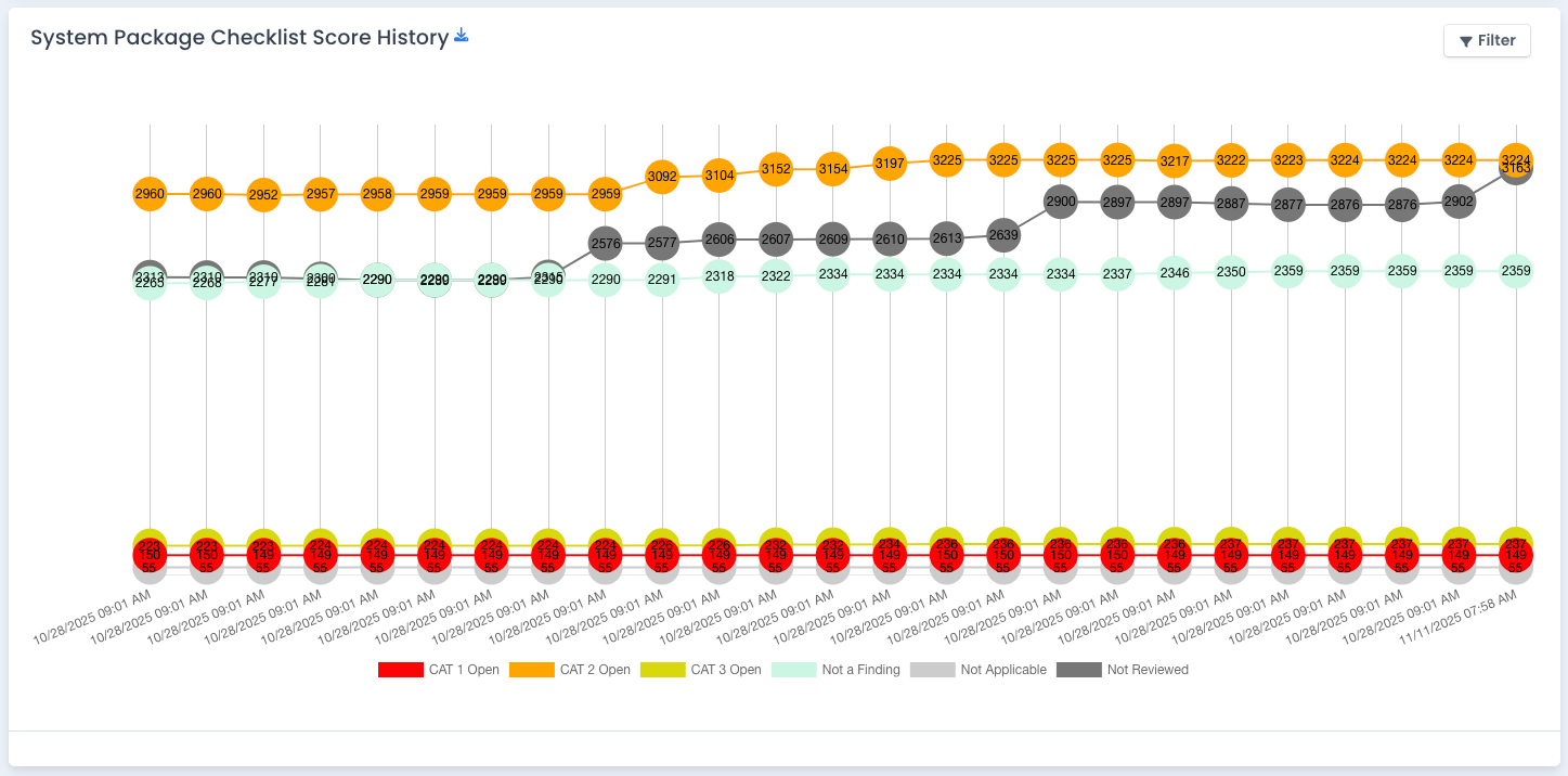 Your Overall Checklist Score for your system package is a total summation of every single checklist in your system package. The score is shown on all system package pages along with the overall system package patch score. This number shows the number of Open CAT 1/high, CAT 2/medium, and CAT 3/low vulnerability items as well as those marked Not a Finding, Not Reviewed and Not Applicable.