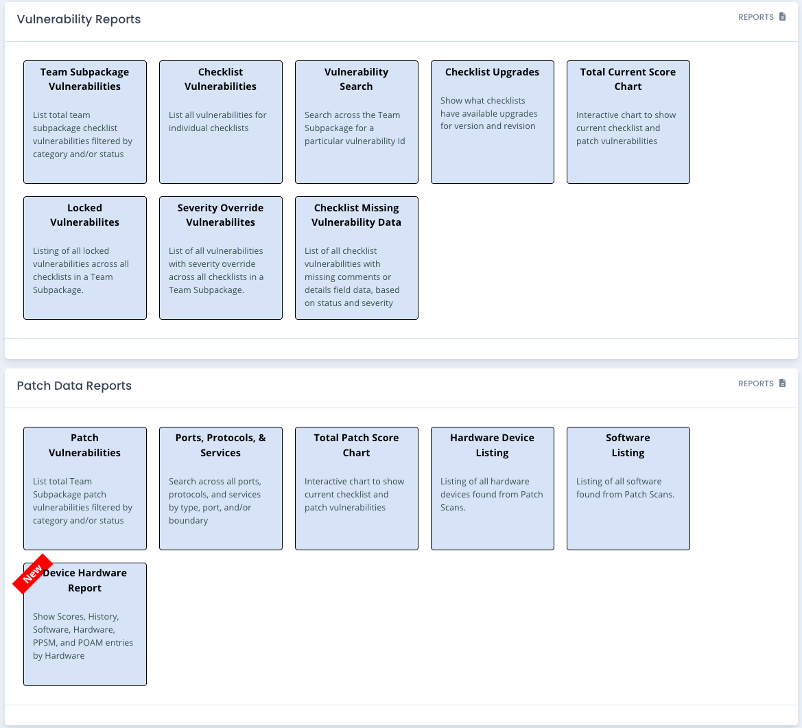 This report shows all checklists, hardware, software, ports/protocols/services, and POAM data for the selected device. This will show devices only assigned to your Team Subpackage.